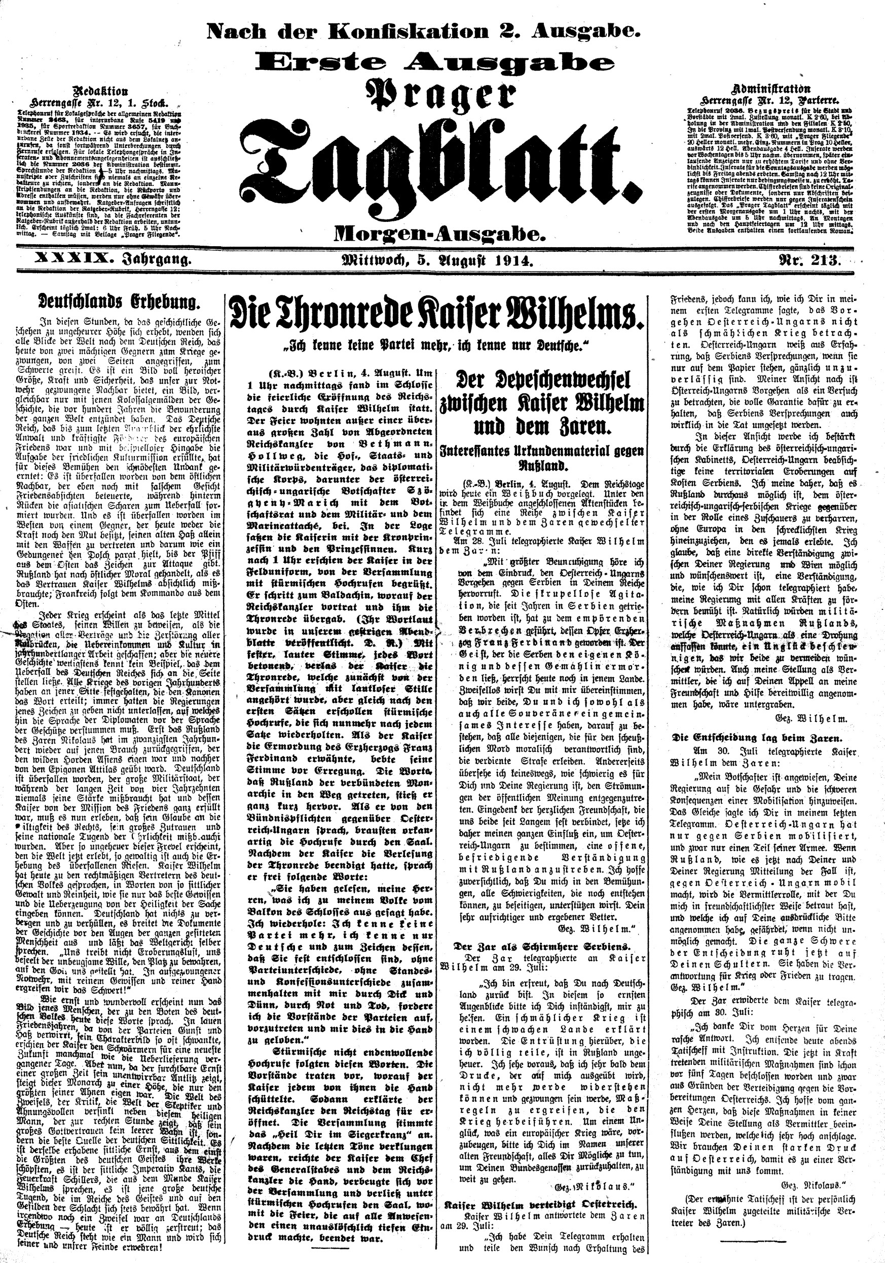 Genauso wie der „Brünner Tagesbote“ und das „Mährische Tagblatt“ sah auch das „Prager Tagblatt“ im Deutschen Reich ein heroisches Vorbild, dessen Stärke den gemeinsamen Sieg verbürgen sollte. Man war nicht nur über die Stärke des Reiches überzeugt, sondern auch davon, dass das Deutsche Reich im europäischen Konflikt nicht als Aggressor oder Provokateur fungierte. Vielmehr war es nach dem Prager Tagblatt ein Opfer, das nur den europäischen Frieden schützen wollte. Um die Unschuld des Reiches zu zu beweisen, verwies man ebenfalls auf verschiedene historische Dokumente, mit denen der Kaiser Wilhelm selbst operiert. In Prag war man sich über die Stärke des Reiches, unter anderem auch wegen der Überzeugung über „die Heiligkeit der Sache“, so sicher, dass die Möglichkeit einer Niederlage, genau wie in anderen Zentren von Böhmen und Mähren, gar nicht in Erwägung gezogen wurde.