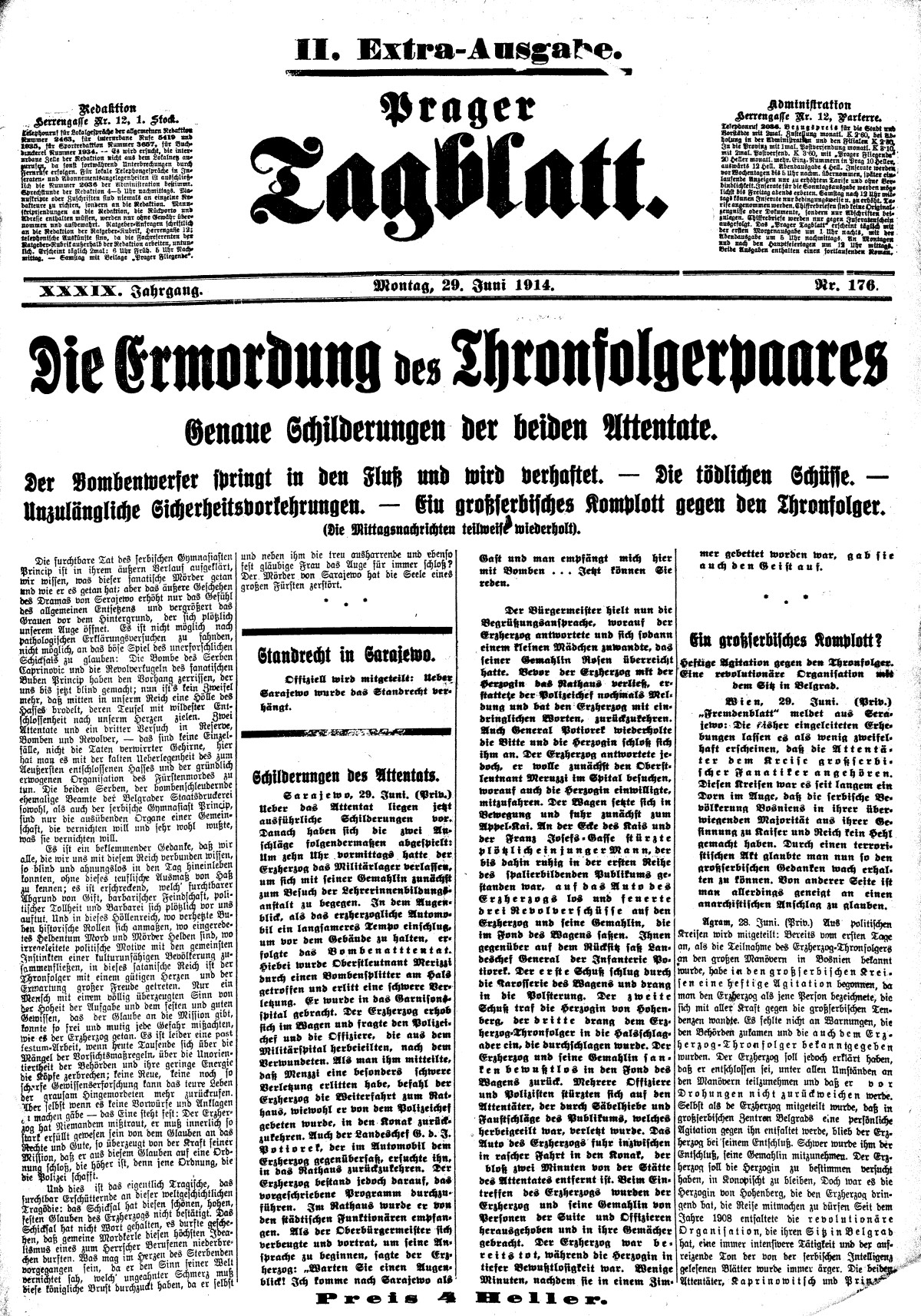 Das Attentat wurde als eine furchtbare Tat bezeichnet, der die nationale und staatliche Situation der Monarchie grundsätzlich veränderte – es wurde zu einer Art „Anagnorisis“. Nach dem Prager Tagblatt erweckte diese weltgeschichtliche Tragödie die Monarchie aus einer gewissen Verblendung, denn es wurde endlich klar, welche Stellungen die Nachbaren der Monarchie und ihre einzelnen Nationen zum Habsburger Reich einnehmen. „Die Bombe des Serben Caprinovic und die Revolverkugeln des fanatischen Buben Princip haben den Vorhang zerrissen, der uns bis jetzt blind gemacht; nun ist´s kein Zweifel mehr, dass mitten in unserm Reich eine Hölle des Hasses brodelt, deren Teufel mit wildesten Entschlossenheit nach unserm Herzen zielen.“ Aus dieser Aussage folgt eindeutig die Ansicht, dass Österreich sich in den Serben vollkommen täuschte. Man hielt die bosnischen Serben lange Zeit für eine „treue“ Nation der Monarchie und zog keine Möglichkeit des Verrates in Erwägung. Diese österreichische Naivität gegenüber den bosnischen Serben sowie den Serben überhaupt verdeckte nach der Zeitung die Tatsache, dass gerade die Serben voll von Hass und Zorn gegenüber der Monarchie waren, was die Zeitung zur Bezeichnung „satanisches Reich“ für die Attentäter und ihr Umfeld veranlasste.